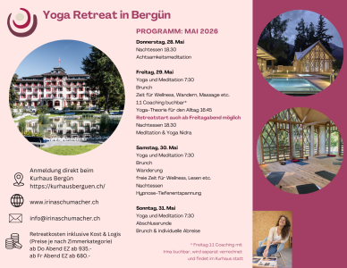 Tue dir etwas Gutes und gönn dir ein wohltuendes Wochenende in den Bündner Bergen mit Irina Schumacher. Wir starten mit Meditation und Yoga in den Tag, stärken uns mit einem feinen Frühstück und verbringen den Tag in der kraftvollen Natur. Nach dem Nachtessen machen wir eine entspannende innere Reise für dein Bewusst– und Unterbewusstsein.